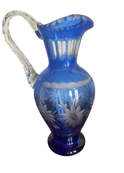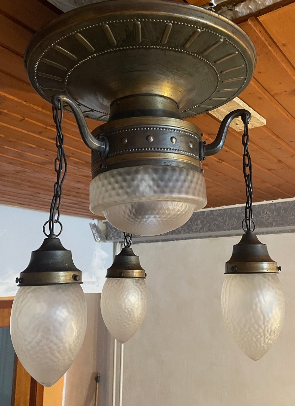 Messing mit altersbedingter Patina,wunderschöne Glaselemente, zentrales Glaselement plus drei hängende Spitzgläser = 4flammig